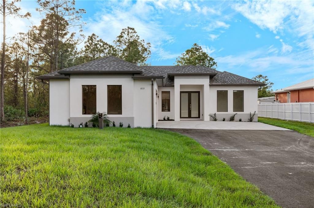 Beautiful, 3 bedroom plus den, new construction situated on an all upland, wooded 1.14 acre lot! As you enter the house, you will notice the great attention to details and high quality, such as tall french doors, a lovely and airy living room with tile throughout the house, a fresh white kitchen with quartz countertop, a waterfall island, beautiful light colored backsplash, and 42" wood cabinets, soaring high tray ceilings, beautiful crown molding on main living area and master bedroom, 6" baseboards throughout, 8-ft doors, and a beautiful touch of modern with waterfall faucets in the bathrooms. Located in the rapidly growing Golden Gate Estates area, just a short driving distance from the impressive, new 150 acre regional water park and great Naples public schools makes this home the perfect investment for your family! MLS pictures are a representation of house of same model, not actual property. There will be some variations.